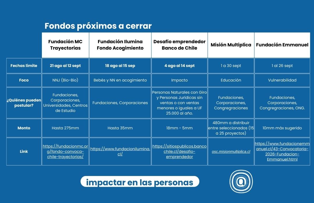 Actualmente existen diversos fondos concursables abiertos que pueden impulsar tus proyectos, especialmente si se enfocan en niñez, educación o vulnerabilidad social.